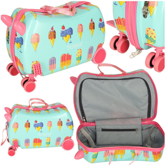 Roztomilý detský cestovný kufrík s motívom zmrzliny je nielen praktický, ale aj zábavný! Vďaka špeciálnej konštrukcii môže dieťa na kufrík sadnúť a vyložiť si nohy na opierky, čo ocení najmä počas dlhších ciest.