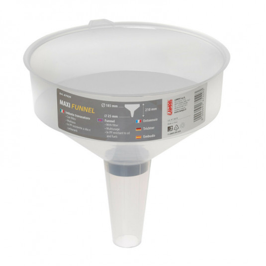 Maxi lievik Viacúčelové, s filtrom. Vyrobené z PP odolného voči oleju a palivu Veľkosť: vstup Ø 185 mm, výstup Ø 25 mm, výška 210 mm