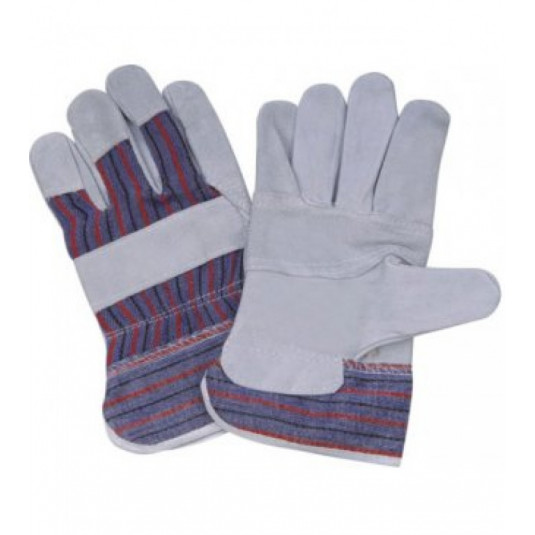 Kombinované pracovné rukavice z jedného kusa silnej hovädzej štiepenky v dlani s podšívkou, bavlnená tkanina na chrbte, s bavlnenou vystuženou manžetou, celokoženými palcami a ukazovákmi a prekrytými špičkami prstov.