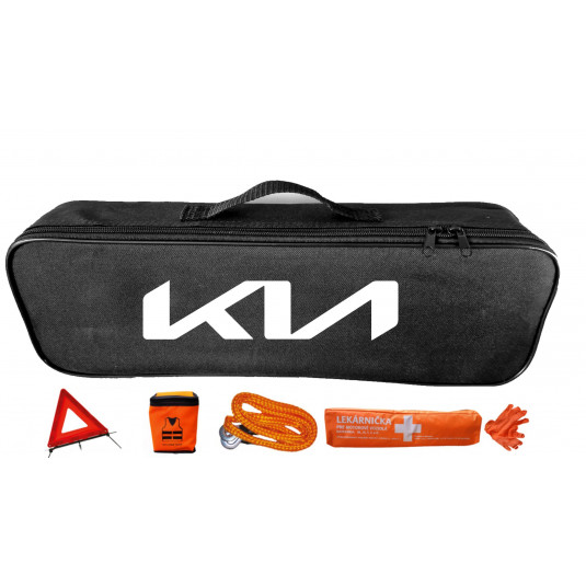 Obsah tašky: autolekárnička, výstražný trojuholník, ťažné lano 3t s karabínou, reflexná vesta v kapsičke, pár dielenských rukavíc