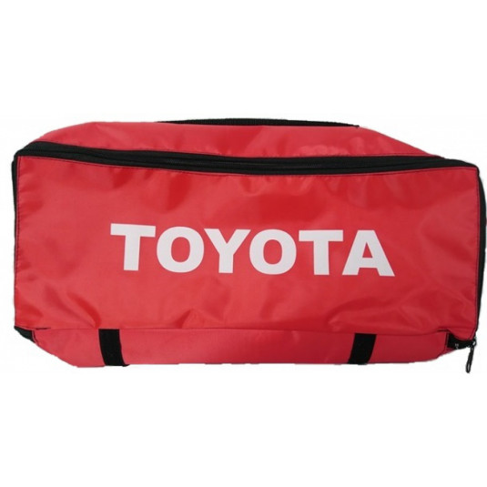 Taška je určená pre povinnú výbavu auta s logom Toyota. Materiál tašky je PVC. Jedná sa o kvalitnú umývateľnú látku, sýtej farby. Potlač tašky sa neodlupuje. Na spodnej strane tašky sa nachádzajú suché zipsy, ktoré zabezpečujú bezproblémové upevnenie tašky povinnej výbavy vo vozidle.