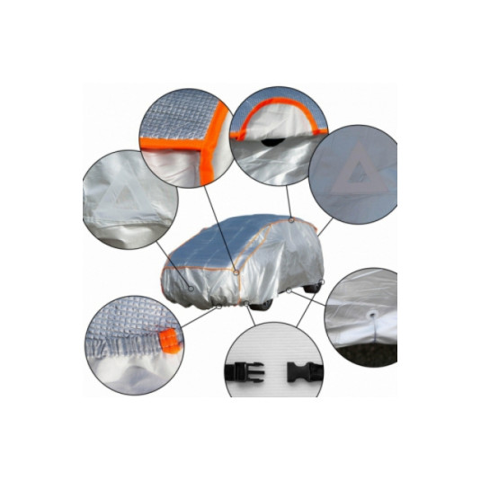 Materiál: reflexná vonkajšia vrstva v hornej časti autoplachty chráni pred UV žiarením a všetkými nepriaznivými a poveternostnými podmienkami. Druhá mäkká vrstva z pevného PVC s hrúbkou 5mm je schopná chrániť vozidlo pred poškodením spôsobeným krupobitím. Autoplachta je vybavená slučkami, ktoré umožňujú pripevnenie k vozidlu pomocou pribaleného lana a visacieho zámku. Ponúka tiež reflexné pruhy na zvýšenie viditeľnosti v noci. Autoplachta je dodávaná s taškou pre praktické uskladnenie.
