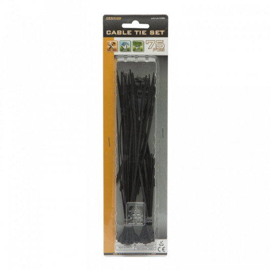 Materiál: Nylon 66 (94V.2) Typ: sťahovací Rozmery – počet – farba: 2.5 x 100mm – 25 ks – čierna 4.5 x 120mm – 25 ks – čierna 2.5 x 200mm – 25 ks – čierna